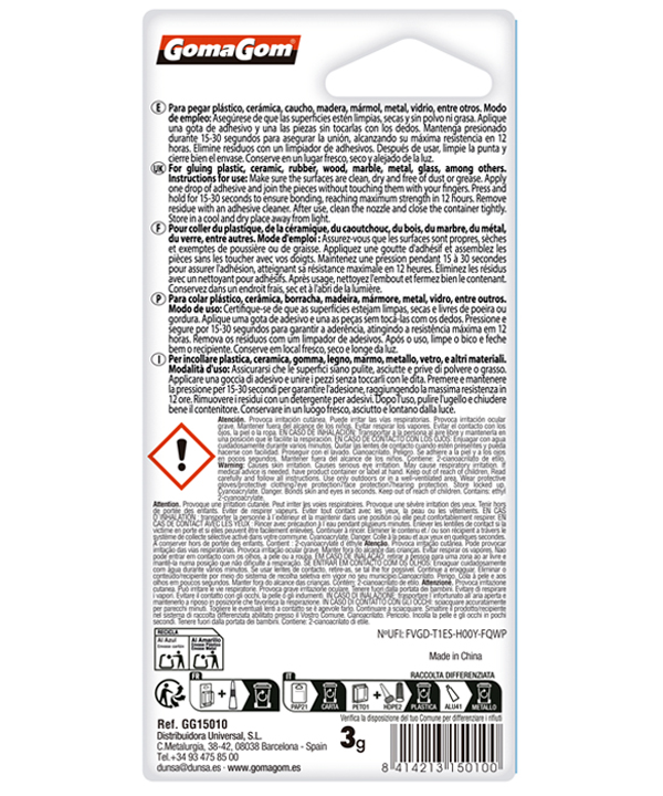 MODO DE EMPLEO: Las superficies a unir deberán estar limpias, secas y exentas de polvo o grasa. Aplique una pequeña cantidad de pegamento. Una gota basta. Si pone demasiado disminuye la efectividad y rapidez de unión. Unir las piezas entre sí, evitando el contacto con los dedos. Presione durante unos 15-30 segundos, tiempo necesario para fragüar la unión, alcanzando la máxima resistencia en unas 12 horas. Conservar en lugar fresco y seco. Protegido de la luz.