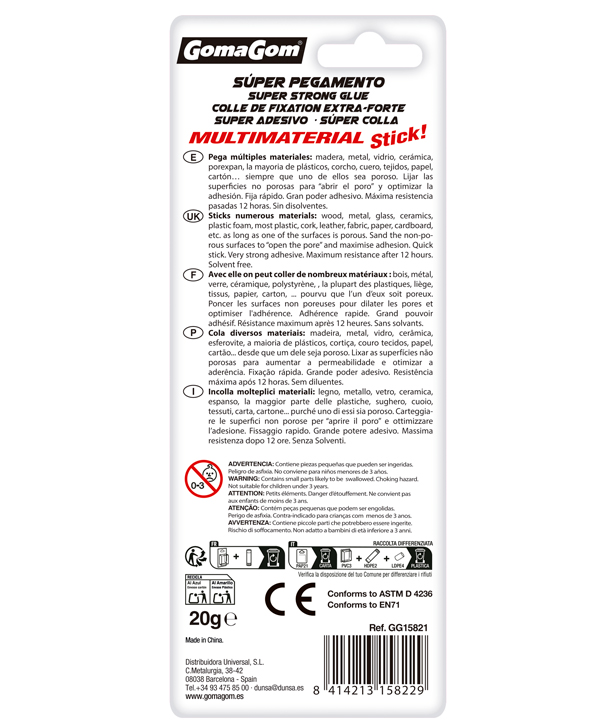 Pega múltiples materiales: madera, metal, vidrio, cerámica, porexpan, plásticos, corcho, cuero, tejidos, papel, cartón… Siempre que uno de ellos sea poroso. Fija rápido. Gran poder adhesivo. Máxima resistencia pasadas 3 horas. Sin disolventes.