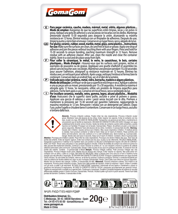 MODE D’EMPLOI: Les superficies à unir doivent être propres, sèches et sans poussière ou graisse. Appliquez une petite quantité de colle, une goutte suffit. Si vous en mettez trop, vous diminuez l’efficacité et la rapidité a union. Assembler les pièces à encoller, en evitant le contact avec les doigts. Appuyez pendant 15-30 secondes, temps nécessaire pour effectuer l’union, en atteignant la résistance maximale au bout de 12 heures. Enlever les restes en frottant avec de l’acétone. Conserver dans un lieu frais et sec, protégé de la lumiere.