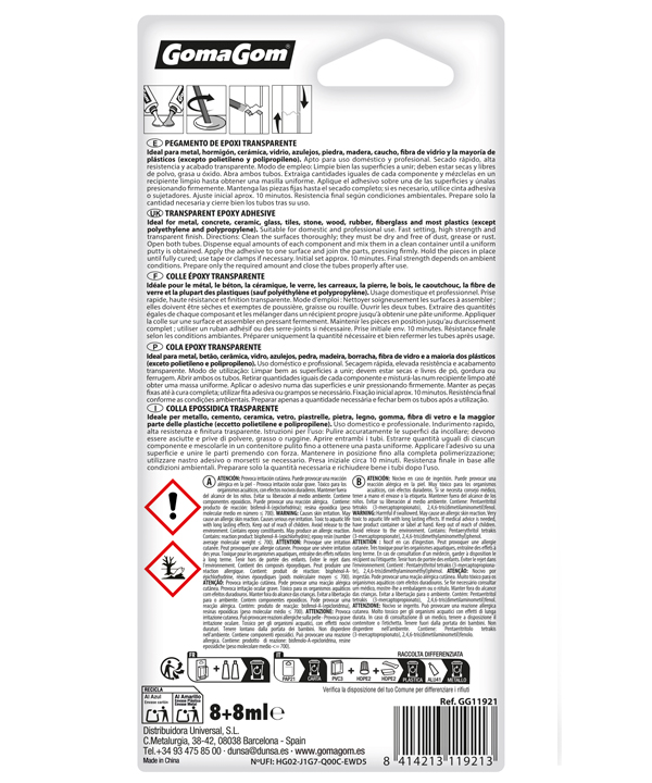 uniforme. Eseguire l’applicazione della miscela ottenuta entro 1 minuto. 4. Utilizzando lo stesso bastoncino, applicare la colla epossidica sulle superfici da incollare mentre vengono compresse no all’asciugatura completa del prodotto (e se necessario, unire le parti con nastro adesivo , rivetti o altri elementi dissaggio). 5. Dopo ogni uso chiudere le confezioni con i relativi tappi.