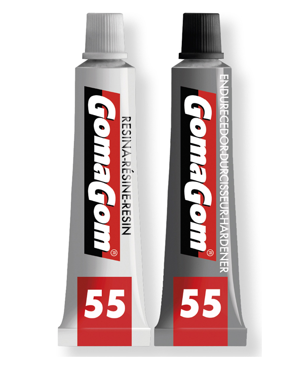 caucciù, bra di vetro, bra naturale, plastica (tranne polietilene e polipropilene), e molti altri materiali. Modalità d’uso : Prima di iniziare l’applicazione, pulire le super ci o i pezzi su cui si applicherà l’adesivo, eliminando eventuali resti di grasso, sporco, ruggine e pittura. 1. Rompere il sigillo di alluminio utilizzando i tappi dei tubi (resina e ssante). 2. Una volta aperti i tubi, dosare ogni componente (resina e ssante) in una proporzione del 50%, usando a tal fine il supporto in plastica in dotazione con il prodotto. Ottenere una miscela uniforme e omogenea per garantire un incollaggio più e cace e resistente. 3.