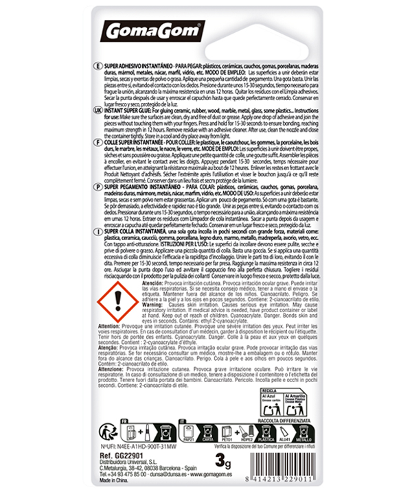 MODO DE USO: As superficies a unir deberão estar limpas, secas e sem polvo nem estar grassentas. Aplicar um pouco de pegamento. Só com uma góta é bastante. Se pör demasiado, a efectividade e rapidez nao é tão grande. Unir as peças entre si, evitando o contacto com os dedos. Pressionar durante uns 15-30 segundos, o tempo necessário para a união, alcançando a máxima resistência em umas 12 horas. Extraer os residuos com acetona. Conservar em um lugar fresco e seco, pretigido da luz.